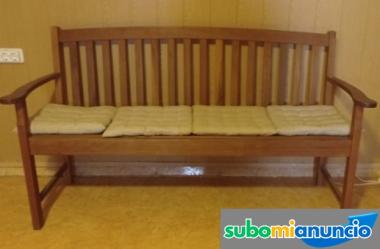 Banco de madera en buen estado. Caben hasta cuatro personas. Medidas: 1,58 ancho 90 alto 46 fondo. Altura del suelo al asiento: 46cm.